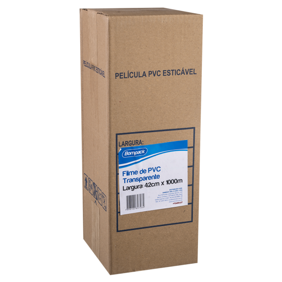 Plástico filme produzido em policloreto de vinil (PVC) da marca Bompack, com espessura 42cm e 1000m de comprimento e contendo 1 unidade por embarque.