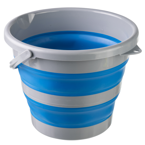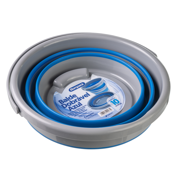Balde dobrável produzido em polipropileno (PP) e silicone da marca Bompack, com volume 10L e contendo 12 unidades por embarque.