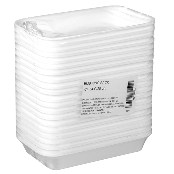Bandeja produzida em poliestireno expandido (EPS) da marca King Pack, com tamanho 21,3x14cm e modelo KP-54, contendo 20 unidades por fardo e 20 fardos por embarque.