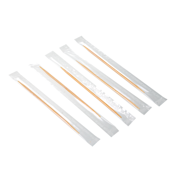 Palitos produzidos em bambu embalados em plástico da marca Bompack, com espessura 1,8mm, contendo 2.000 unidades por caixa e 24 caixas por embarque.
