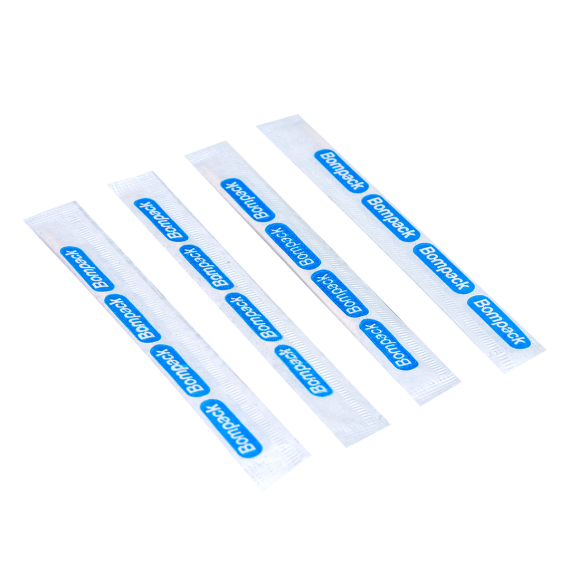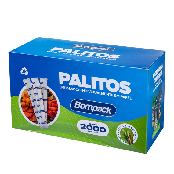 Palitos produzidos em bambu embalados em papel da marca Bompack, com tamanho 6,3cm e 1,8mm de espessura, contendo 2000 unidades por caixa e 24 caixas por embarque.