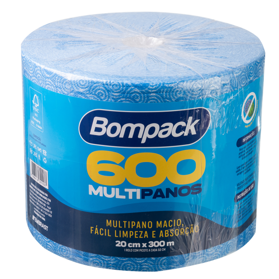 Multipanos produzidos 50% em fibra de madeira e 50% fibra de poliéster da marca Bompack, com tamanho 300m e largura 20cm, contendo 1 unidade por embarque.