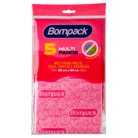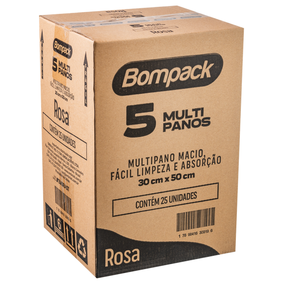 Multipanos produzidos em 70% viscose e 30% poliéster da marca Bompack, com tamanho 30x50cm, contendo 5 unidades por embalagem e 25 embalagens por embarque.