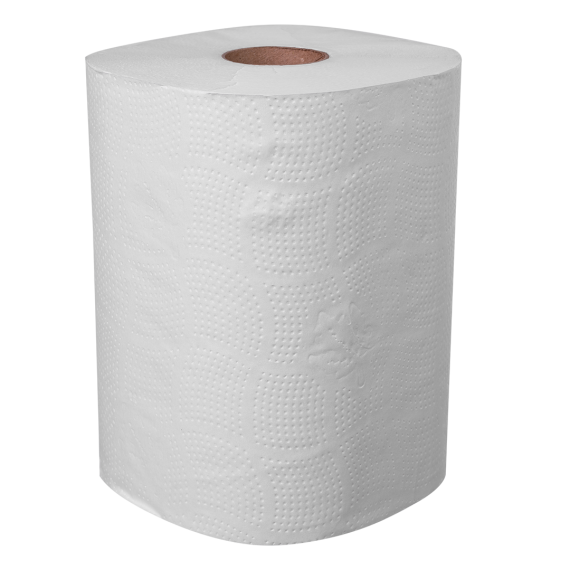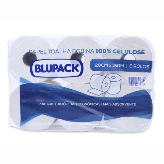 Papel toalha produzido em papel 100% celulose da marca Blupack, com tamanho 20cm por 150m e contendo 6 rolos por embarque.