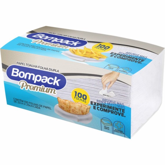 Papel toalha produzido 100% celulose virgem da marca Bompack, com tamanho 22x20cm e contendo 100 unidades por embalagem.