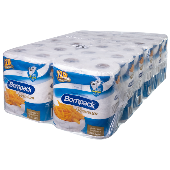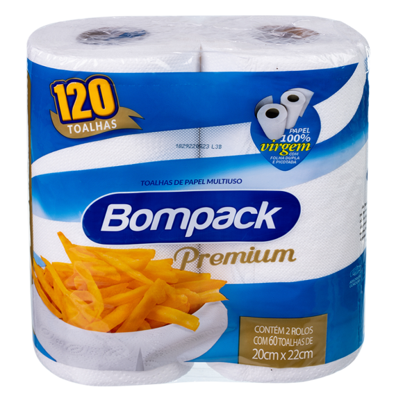 Papel toalha produzido em fibras 100% virgens da marca Bompack, com tamanho 20x22cm e contendo 2 rolos por embalagem.
