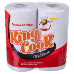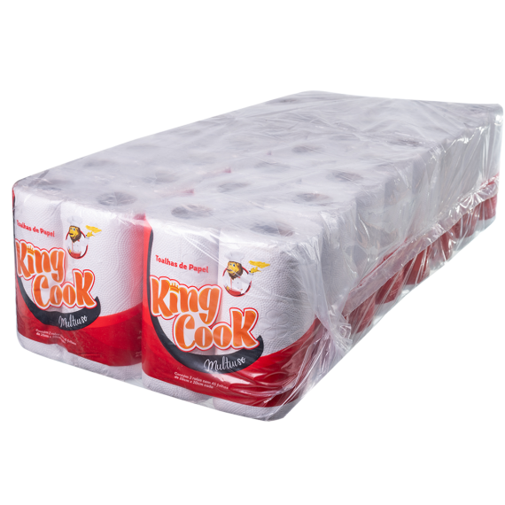 Papel toalha produzido em fibras 100% virgens da marca King Cook, com tamanho 20x20cm e contendo 45 folhas (2 rolos) e 16 embalagens por embarque.