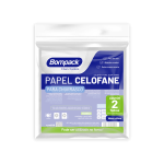 Papel celofane da marca Bompack com tamanho 100x60cm, contendo 2 unidades por embalagem e 25 embalagens por embarque.
