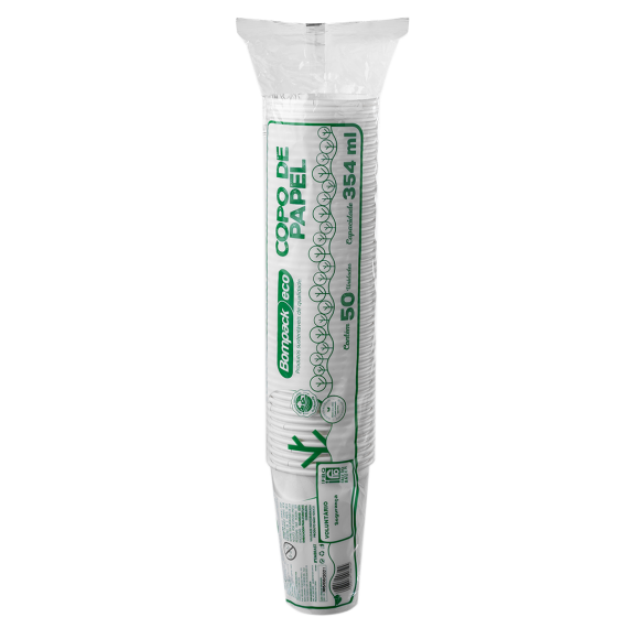 Copos produzidas em 95% papel e 5% polietileno (PE) da marca Bompack, com capacidade 354ml e modelo 12OZ, contendo 50 unidades por embalagem e 20 embalagens por embarque.
