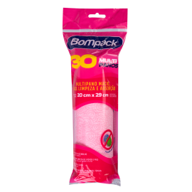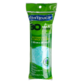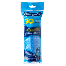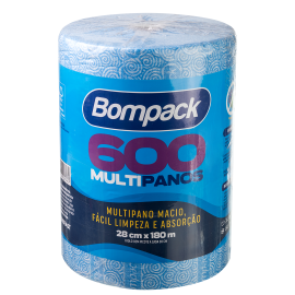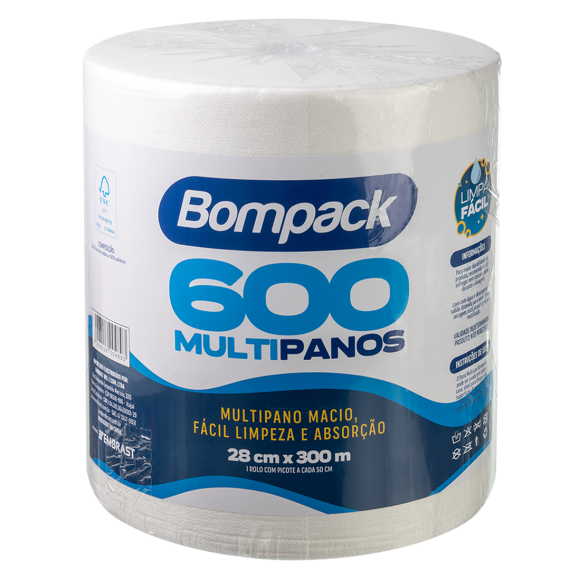Multipanos produzidos em 50% fibra de madeira e 50% poliéster da marca Bompack, com tamanho 28x50cm (pano) por 300m (rolo picotado) e contendo 600 panos por rolo.