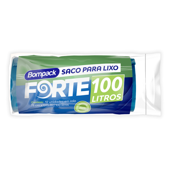 Saco de lixo produzido em polietileno de alta densidade (PEAD) e polietileno de baixa densidade linear e pigmentos (PEBD), da marca Bompack, com tamanho 75cm por 1,05m, modelo Forte Linha Roll contendo 15 unidades.