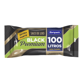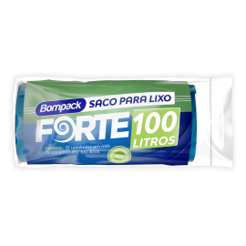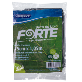 Saco de lixo produzido em polietileno de alta densidade (PEAD) da marca Bompack, com tamanho 75cm por 1,05m e capacidade 100L, contendo 20 unidades por rolo.