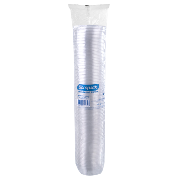 Separador duplo produzido em polietileno tereftalato (Pet) da marca Bompack, de modelo TB02508-2, contendo 100 unidades por embalagem e 20 embalagens por embarque.