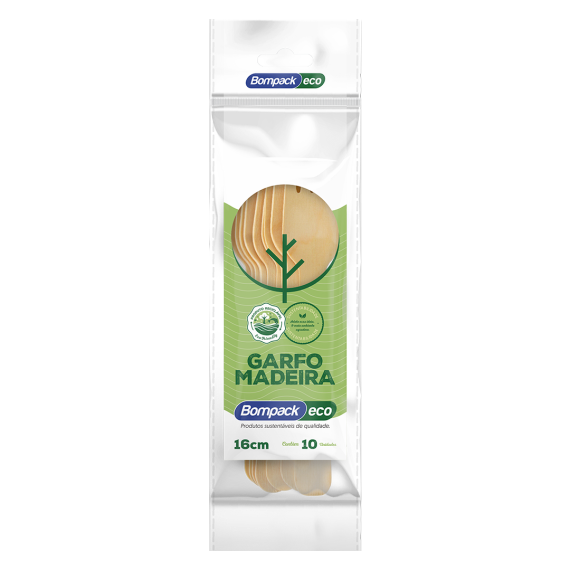 Garfos produzidos em madeira da marca Bompack® Eco, 10 unidades por embalagem e 20 embalagens dividas em 20 caixas por embarque (caixa master).