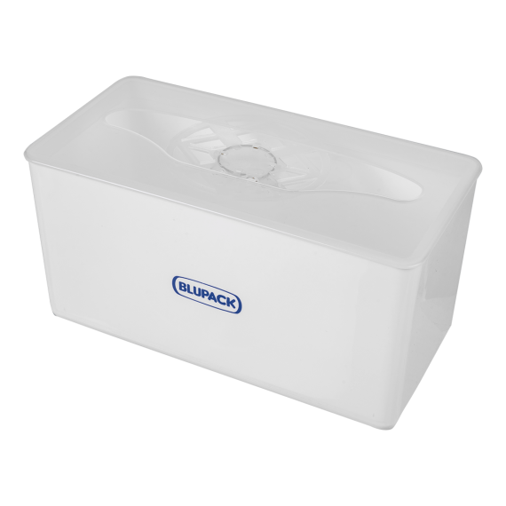Toalheiro produzido em termoplástico de alta resistência da marca Blupack, com tamanho 24x12,3x11,8cm e contendo 15 unidades por embarque.