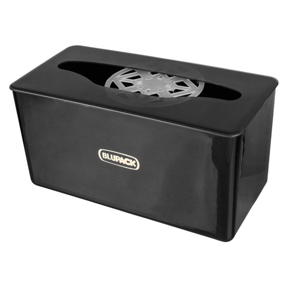 Toalheiro produzido em termoplástico de alta resistência da marca Blupack, com tamanho 12x12x24cm e contendo 15 unidades por embarque.
