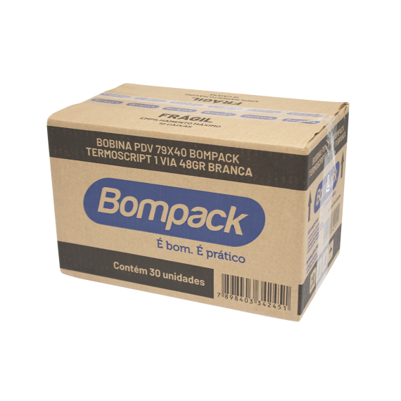 Bobina produzida em papel térmico da marca Bompack, com tamanho 7.9cm por 40m e contendo 30 unidades por rolo.