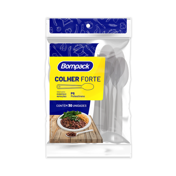 Colher produzida em poliestireno (PS) da marca Bompack, contendo 30 unidades por embalagem e 10 embalagens por embarque.