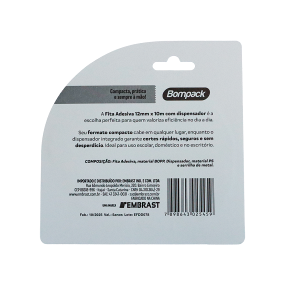 Fita produzida em polipropileno biorientado (BOPP) e dispensador produzido em poliestireno (PS) e serrilha de metal da marca Bompack, com espessura 12mm e 10m de comprimento, contendo 90 unidades por embarque.