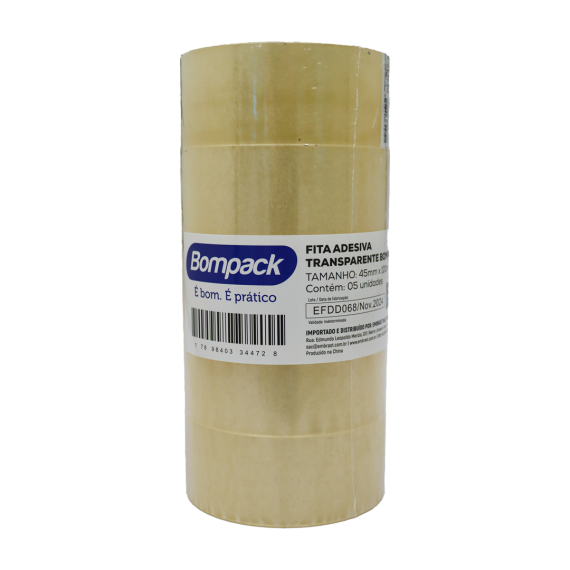 Fita produzida em polipropileno (PP) da marca Bompack, com espessura 45mm e comprimento 100m, contendo 100 unidades por embarque.