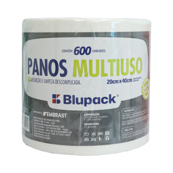 Multipanos produzidos 50% em fibra de madeira e 50% em poliéster da marca Blupack, com tamanho 20x40cm (pano) por 240m (rolo picotado) e contendo 600 panos por rolo.