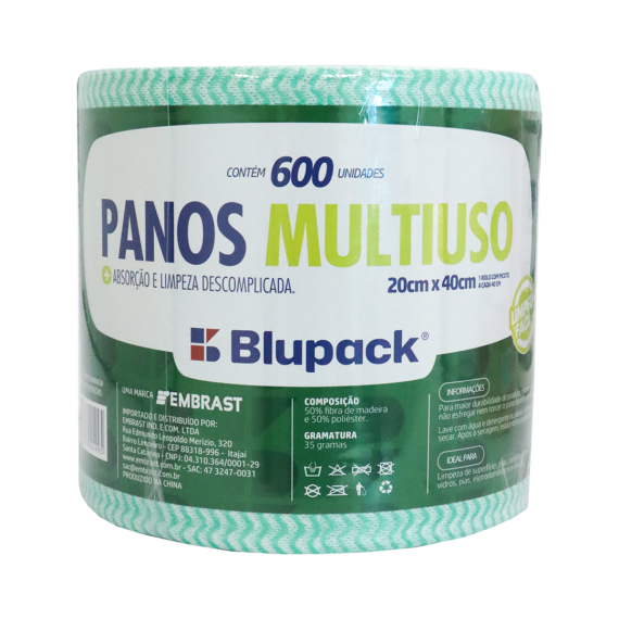 Multipanos produzidos 50% em fibra de madeira e 50% em poliéster da marca Blupack, com tamanho 20x40cm (pano) por 240m (rolo picotado) e contendo 600 panos por rolo.