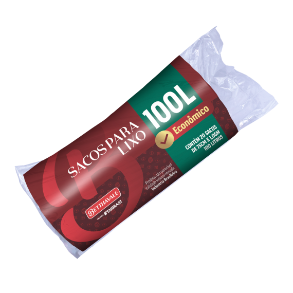 Saco de lixo produzido em polietileno de alta e baixa densidade e pigmentos da marca Betthavale, com tamanho 75cm por 1,05m por saco picotado, contendo 100L de capacidade e 10 rolos por embarque.
