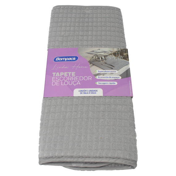 Tapete escorredor de louça produzido em poliéster e microfibra da marca Bompack®, com tamanho 38x50cm e contendo 24 unidades por embarque.