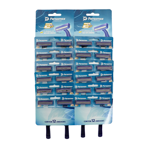 Aparelho de barbear produzido em resinas termoplásticas, aço inoxidável revestido com cromo da marca Bompack, contendo 2 lâminas e 288 cartelas por embarque.