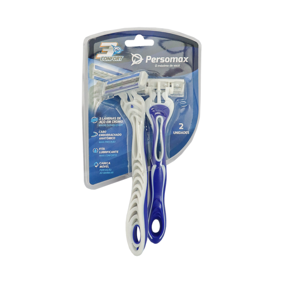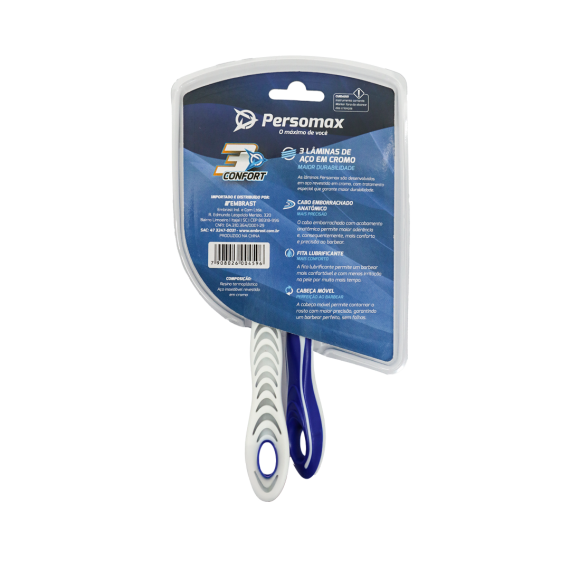 Aparelho de depilação produzido em resinas termoplásticas, aço inoxidável revestido com cromo e fita lubrificante da marca Persomax, no modelo Confort e contendo 2 aparelhos por cartela e 144 cartelas por embarque.