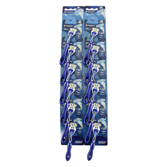 Aparelho de depilação produzido em resinas termoplásticas, aço inoxidável revestido com cromo e fita lubrificante da marca Bompack, contendo 3 lâminas por aparelho e 144 aparelhos por embarque.