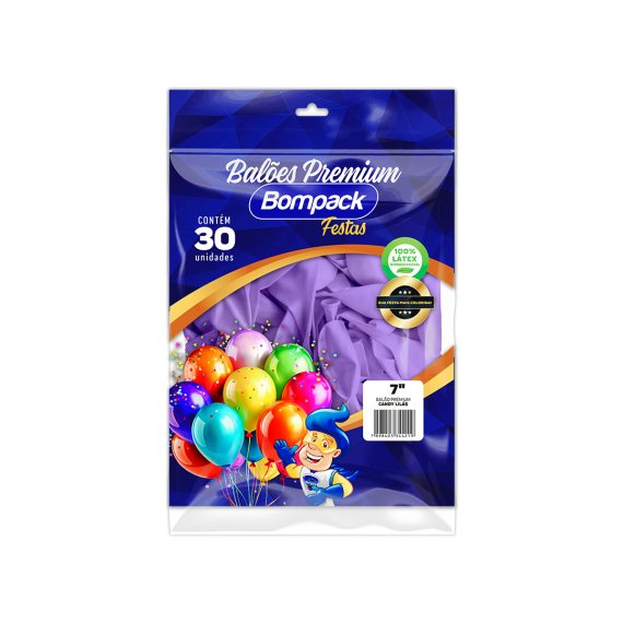 Balões produzidos em látex natural, antioxidantes, estabilizantes e pigmentos da marca Bompack, no modelo N7, contendo 30 unidades por embalagem e 30 embalagens por embarque.