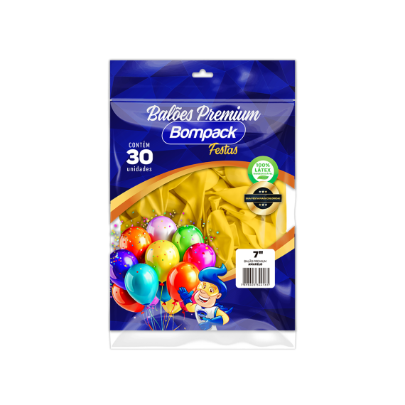Balões produzidos em látex natural, antioxidantes, estabilizantes e pigmentos da marca Bompack, no modelo N7, contendo 30 unidades por embalagem e 30 embalagens por embarque.