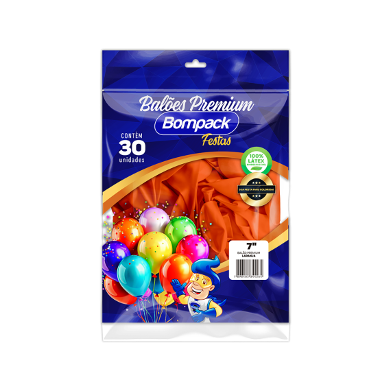 Balões produzidos em látex natural, antioxidantes, estabilizantes e pigmentos da marca Bompack, no modelo N7, contendo 30 unidades por embalagem e 30 embalagens por embarque.