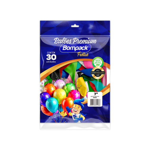 Balões produzidos em látex natural, antioxidantes, estabilizantes e pigmentos da marca Bompack, no modelo N7, contendo 30 unidades por embalagem e 30 embalagens por embarque.
