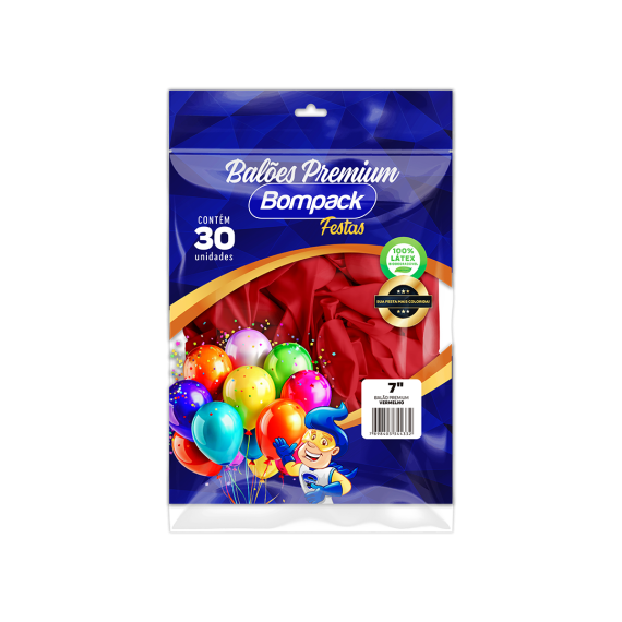 Balões produzidos em látex natural, antioxidantes, estabilizantes e pigmentos da marca Bompack, no modelo N7, contendo 30 unidades por embalagem e 30 embalagens por embarque.