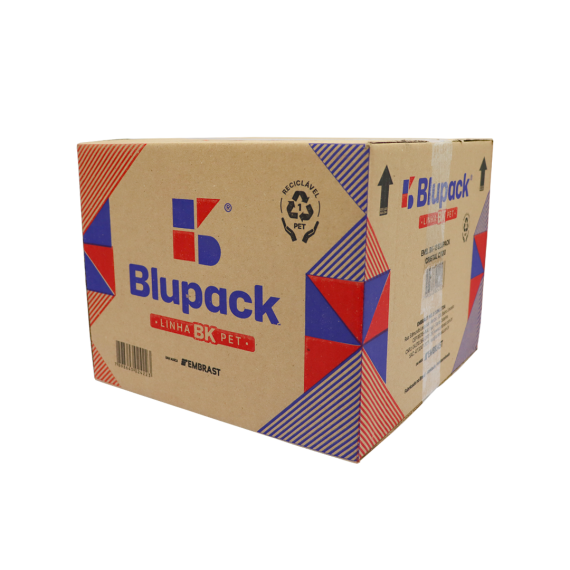 Embalagem produzida em polietileno tereftalato (Pet) da marca Blupack, no modelo BK-13, contendo 100 unidades por embarque.