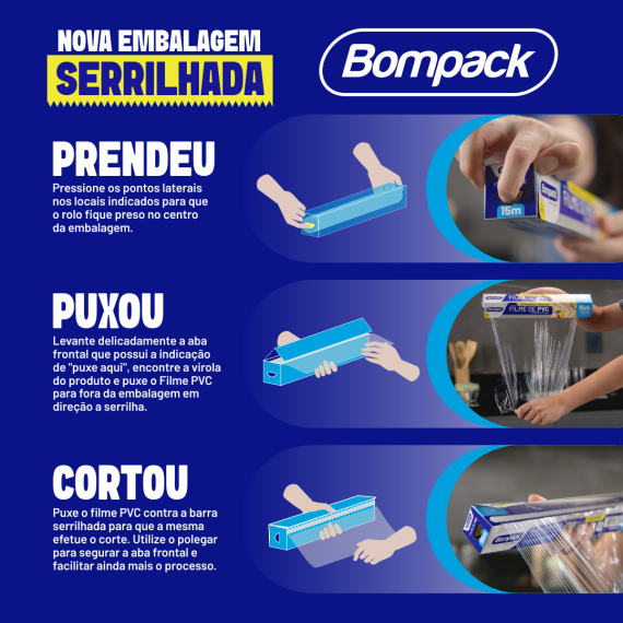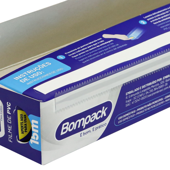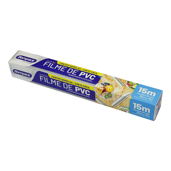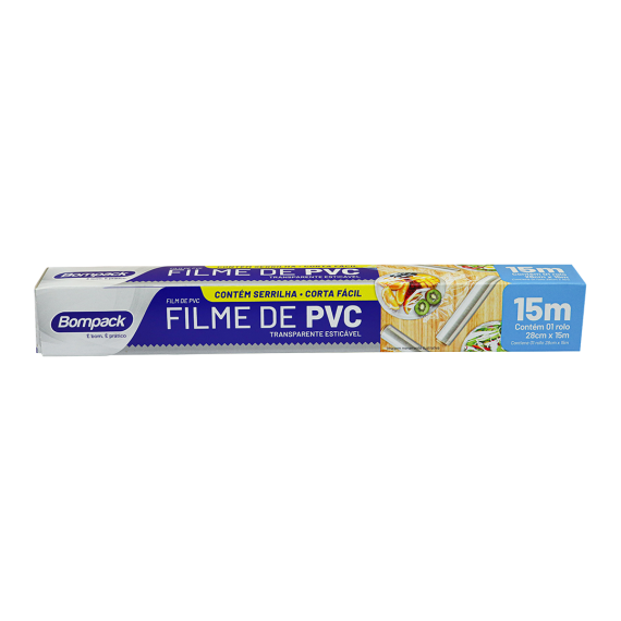 Plástico filme produzido em policloreto de vinil (PVC) com serrilha da marca Bompack, com tamanho 28cm por 15m e contendo 25 unidades por embarque.