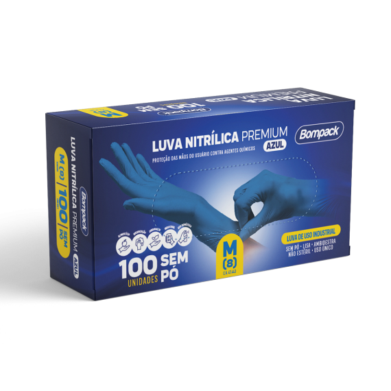 Luvas produzidas em borracha sintética de nitrilo da marca Bompack, com tamanho M, contendo 100 unidades por caixa e 20 caixas por embarque.