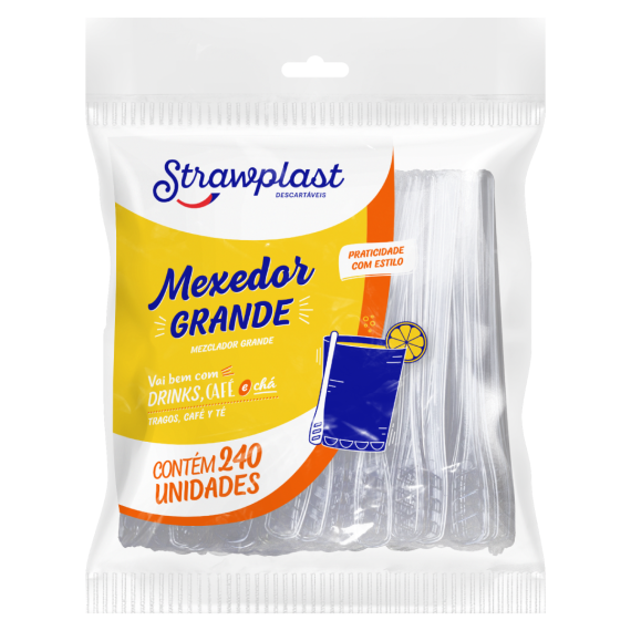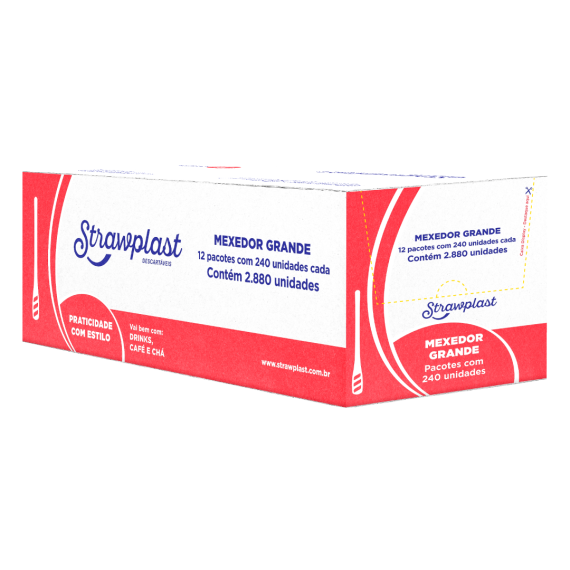 Mexedores produzidos em poliestireno (PS) e pigmentos atóxicos da marca Strawplast, com tamanho 11,1x1,1cm e modelo MSG-801, contendo 240 unidades por embalagem e 12 embalagens por embarque.