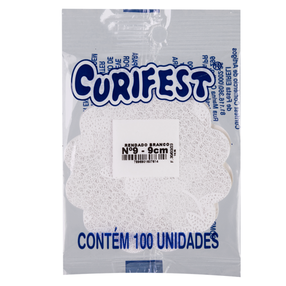 Fundos rendados produzidos em polipropileno (PP) e tinta atóxica da marca Curifest, com diâmetro 9cm e modelo N09, contendo 1 embalagem por embarque.
