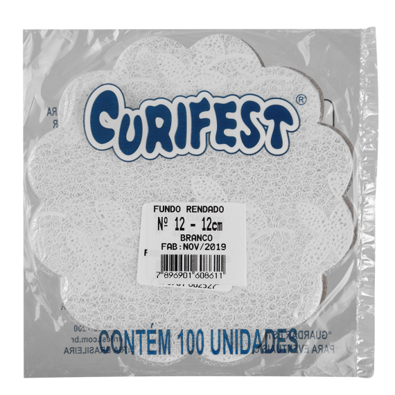 Fundo rendado produzido em polipropileno (PP) e tinta atóxica da marca Curifest, com diâmetro 12cm e modelo N12, contendo 1 embalagem por embarque.