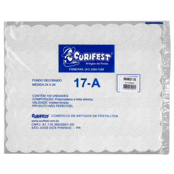 Fundo rendado produzido em polipropileno (PP) e tinta atóxica da marca Curifest, com tamanho 24x29cm e modelo N17-A, contendo 1 embalagem por embarque.