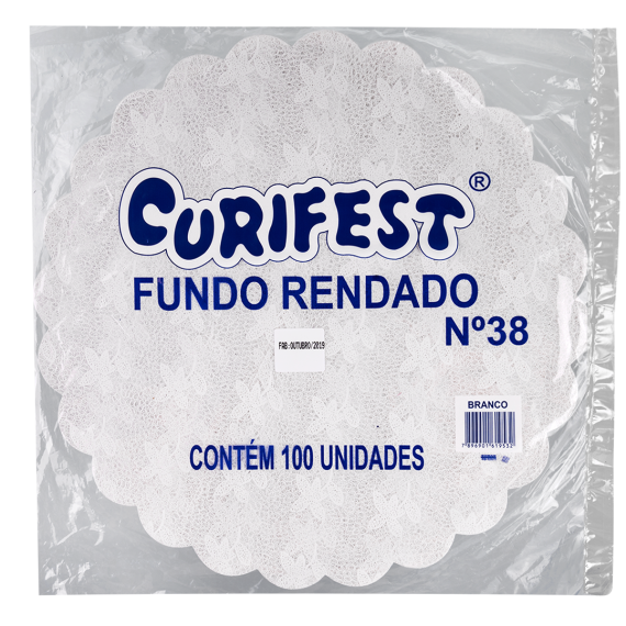 Fundo rendando produzido em polipropileno (PP) e tinta atóxica da marca Curifest, com diâmetro 38m e contendo 1 unidade por embarque.